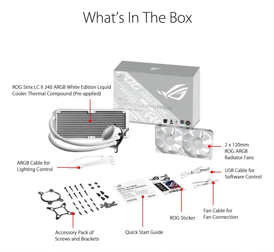 El ASUS ROG Strix LC II 240 ARGB White Edition es la versión más elegante y potente de la línea Strix. Diseñado para entusiastas y gamers exigentes, este sistema de refrigeración líquida todo en uno (AIO) combina un rendimiento térmico superior, bajo nivel de ruido, y un diseño estético blanco impecable con RGB direccionable (ARGB).