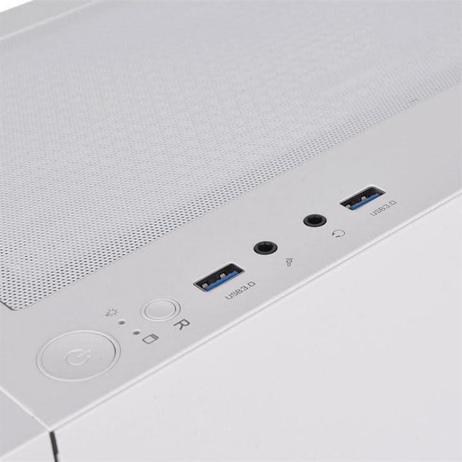 Su interior incluye PSU cover, bahías de almacenamiento versátiles y filtros antipolvo magnéticos que simplifican el mantenimiento. El panel I/O incorpora 2 puertos USB 3.0 y conectores de audio HD, ofreciendo conectividad rápida y práctica.